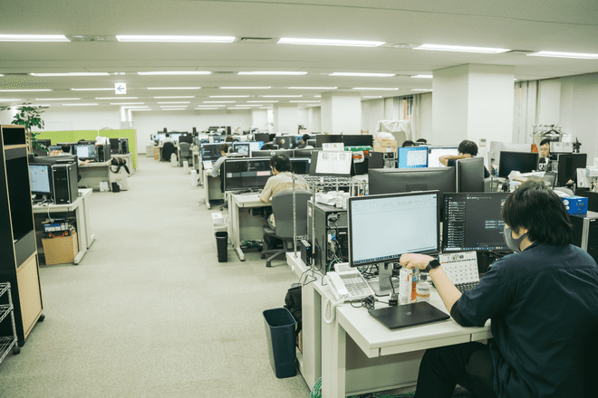 広いオフィスは緑を基調とした落ち着いた空間です。